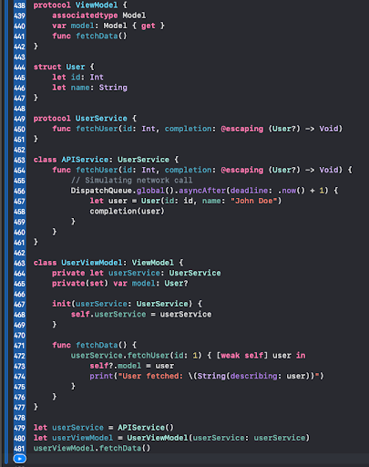 In this MVVM example, the ViewModel protocol defines a contract for view models, while UserViewModel conforms to this protocol. The UserService protocol abstracts the data fetching mechanism, which makes UserViewModel more testable and flexible.