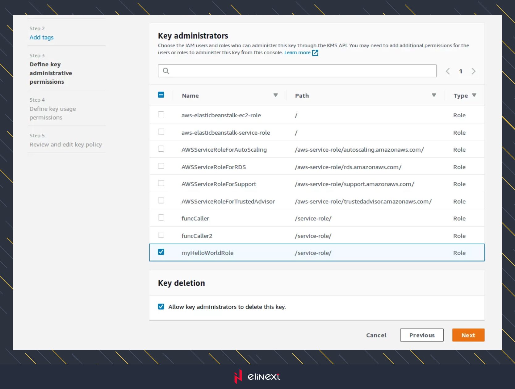 On the third step you can select the roles to define who can manage your key using AWS KMS API. If you need more details about roles usage, that form has a link to the documentation.