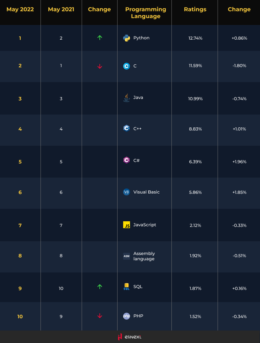 As of May 2022, the TIOBE Index ranks Python as the most popular programming language: