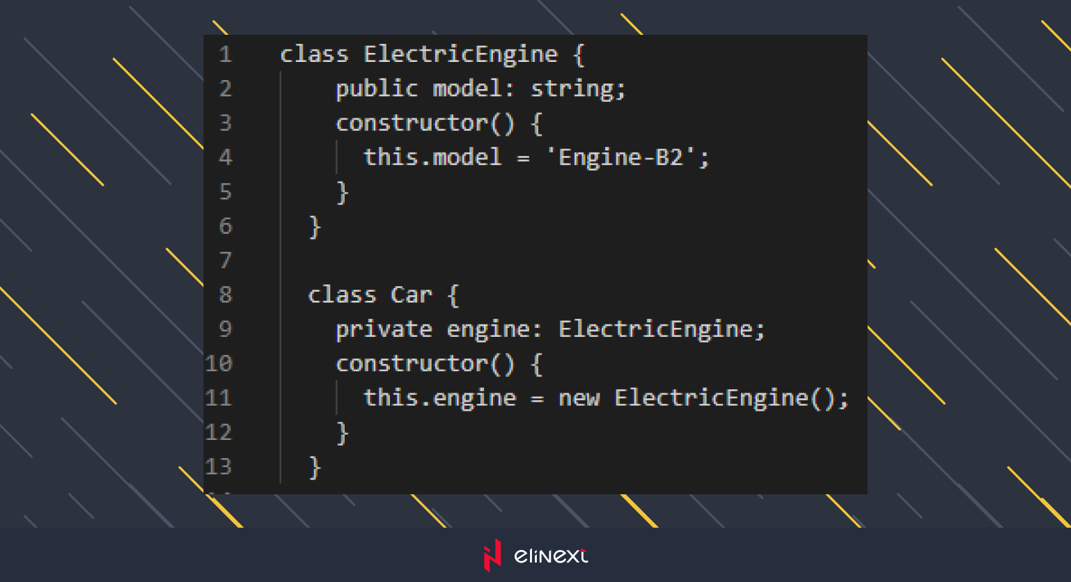 In this code snippet, we have implemented a relationship called Composition. It occurs when one entity incorporates another entity inside itself and fully manages its lifecycle. This concept is particularly useful in application development where different components need to be tightly coupled to ensure proper functionality. The process is quite clear and straightforward. We simply labeled the constructor of the ElectricEngine class, allocated memory for it, and directed the variable this.engine to this memory location. Now, through the reference, we can access the ElectricEngine class from the Car class.