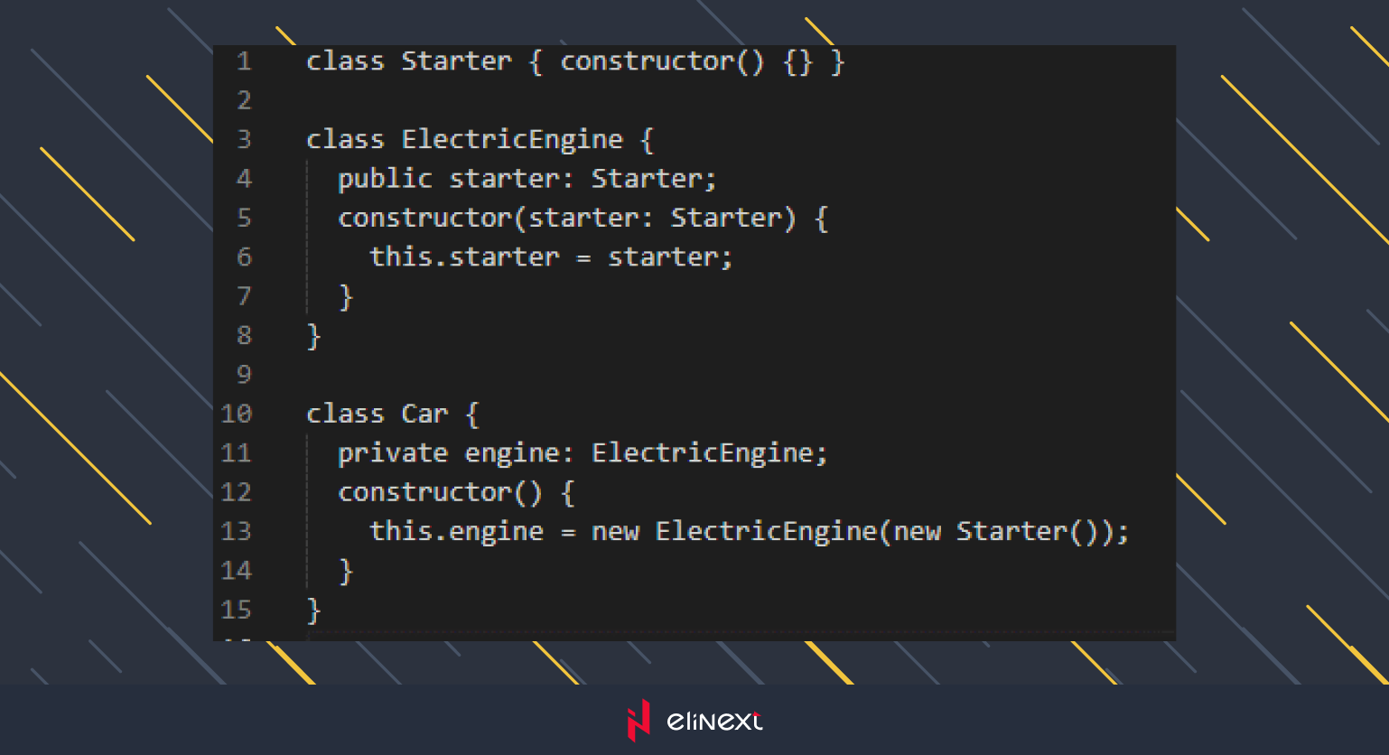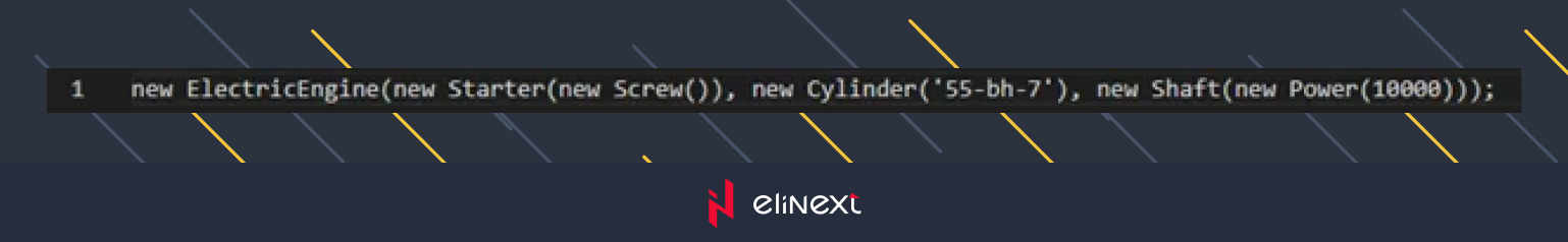 Here, we have added another entity. Now, the constructor of our electric engine will take an object of the Starter type as a parameter. In turn, the Car class, when creating an instance of the ElectricEngine class, must pass the new ElectricEngine(new Starter()) as an argument. Now, imagine that ElectricEngine takes not just one class in its constructor but at least 3-4. Then, the invocation of the ElectricEngine class constructor will increase accordingly. And this is not the limit: