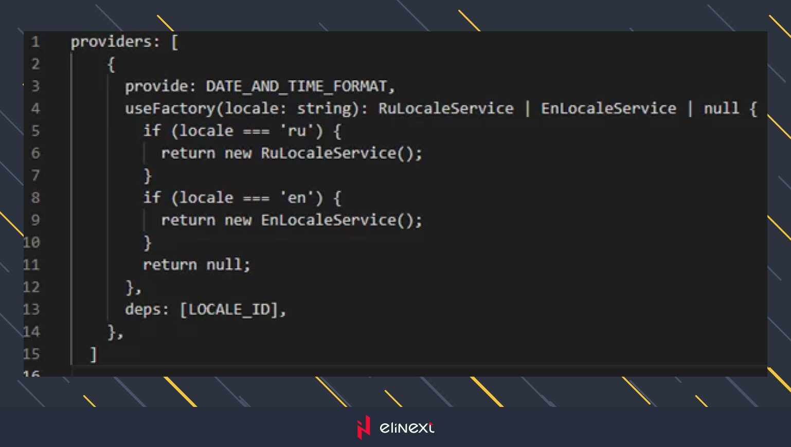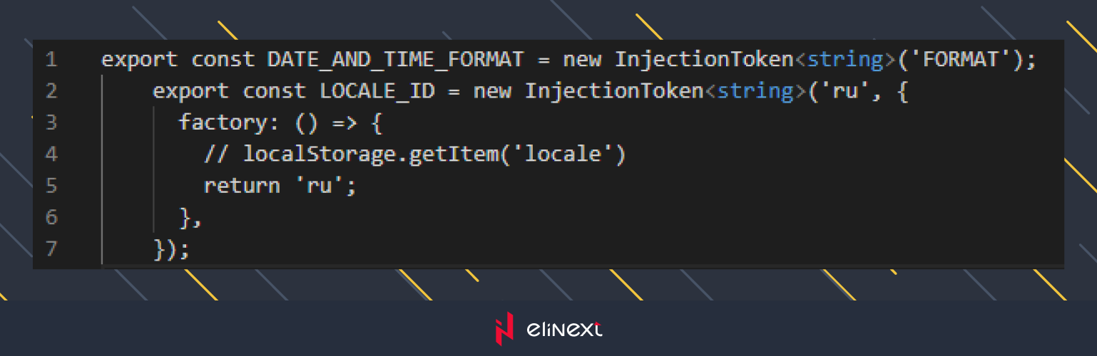 Another providing option is to use useFactory. This can be useful when we want to extract some logic that will be calculated “on-the-fly,” and we can also add some conditions there. Instead of creating a whole service, we can provide a specific piece of logic through DI (DATE_AND_TIME_FORMAT — InjectionToken, which we’ll cover it later):