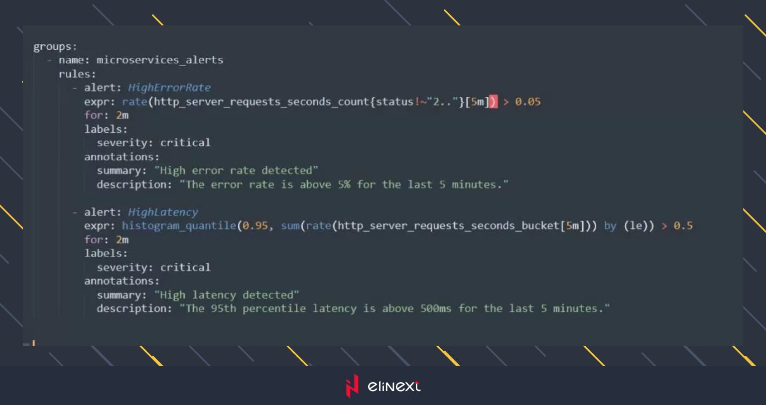 Configure Prometheus to send alerts based on specific conditions. Here’s an example configuration for alerting on high error rates and latency.