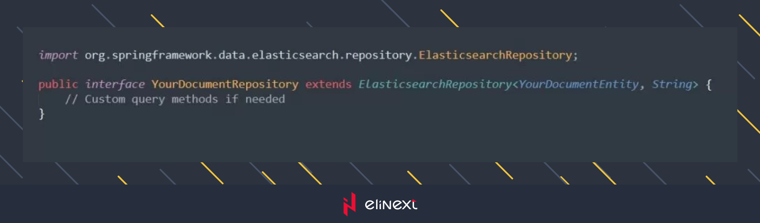 Create a repository interface extending `ElasticsearchRepository` provided by Spring Data Elasticsearch. This interface will handle CRUD operations on the Elasticsearch index.