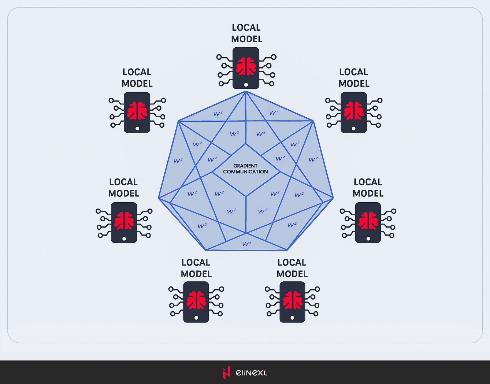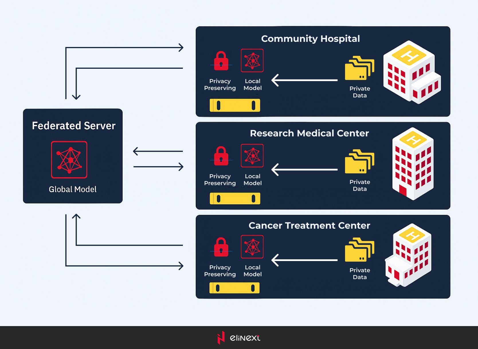 Once the central model is updated with the new parameters, it is redistributed to the client devices for another round of training. With each cycle, the models gather a broader range of information and improve continuously without compromising privacy.