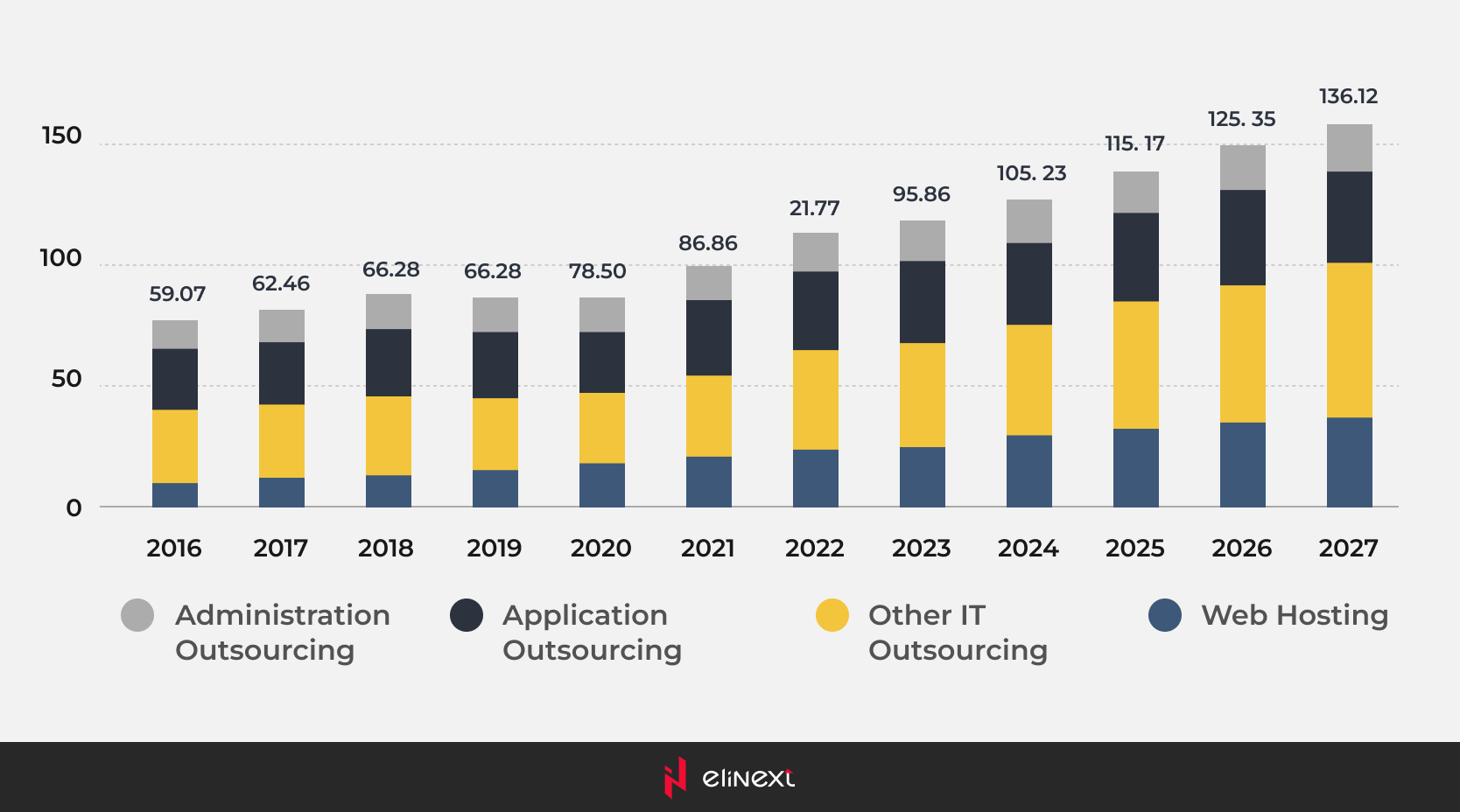 The same year, the IT outsourcing market in Asia-Pacific reached $214 billion. According to Straits Research, by 2030, Asia-Pacific is expected to hold the largest market share, reaching $349 billion and growing at a CAGR of 6%. By 2027, the European IT outsourcing market is expected to grow at a CAGR of 8.06%, reaching a market volume of $186.40bn.