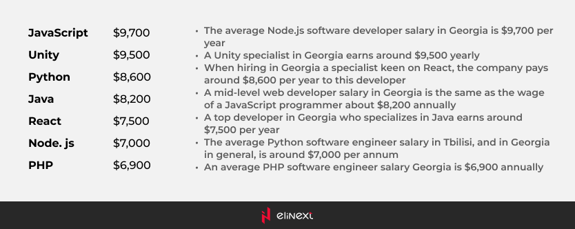 According to Qubit Labs, these are the average salaries of Georgian software developers by technology: