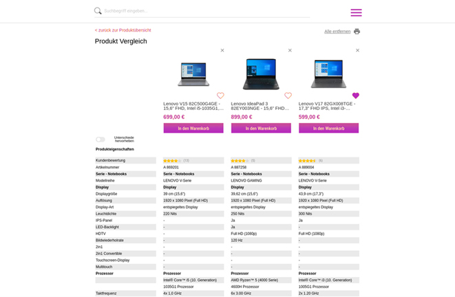 The sheer variety of notebooks and similar technical products for sale, each defined by a range of technical parameters, often spells choice paralysis for shoppers and stops them from buying. To help remove that block, the client requested us to develop a comparison page.