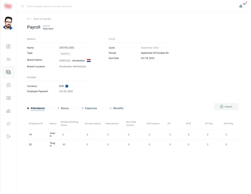 The Payroll module is probably the most important one. It enables company representatives to activate payroll for employees added to the Organization module. They can configure a payroll with parameters like the payout frequency and date, the start date of a pay period, bonuses, and others.