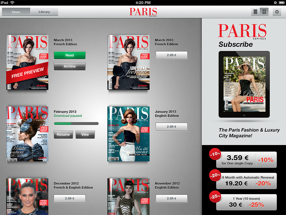 The customer wanted an application for reading the Paris Capitale magazine on the iPad. It had to be integrated into Apple’s iOS Newsstand, provide the ability to purchase and download magazine issues, and allow the user to sign up for a subscription.