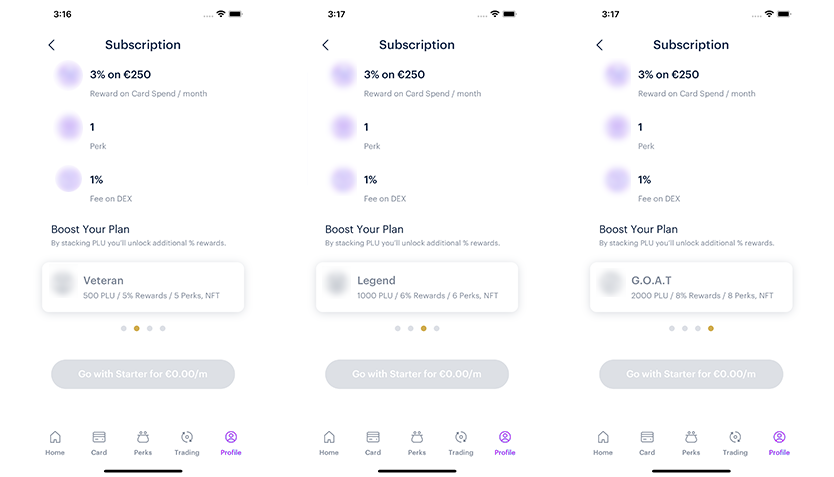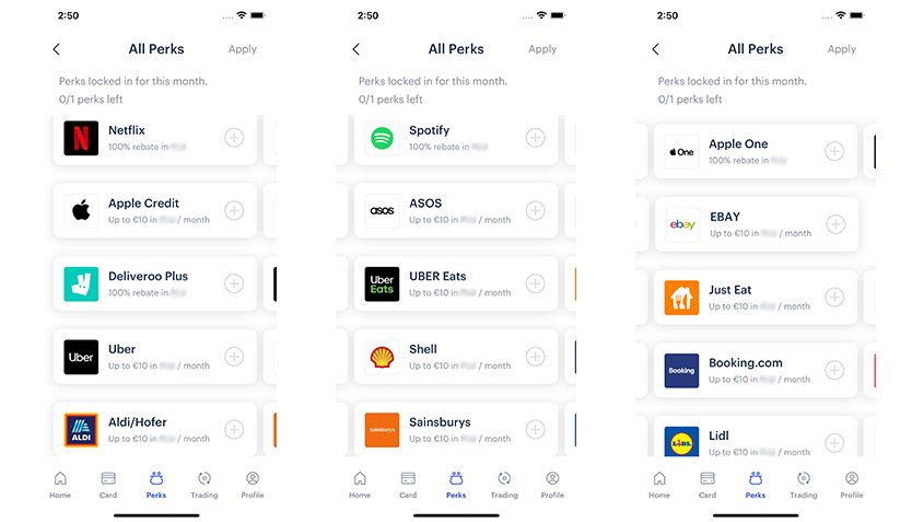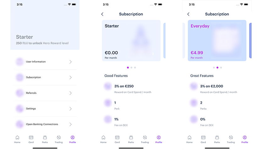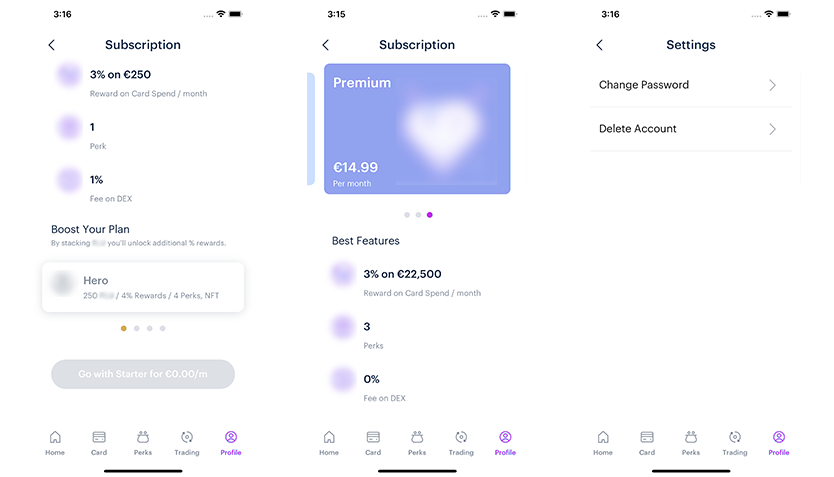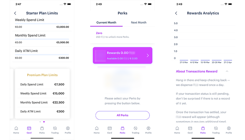 - Perks: the user can use the card to subscribe to services, such as Netflix, Spotify, etc., and get rewards in cryptocurrency. The user can also view their perks for this month or the next month and see their perks increase and decrease depending on their spending and their subscription plan.