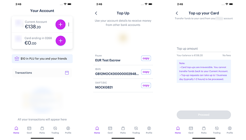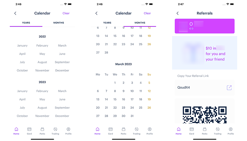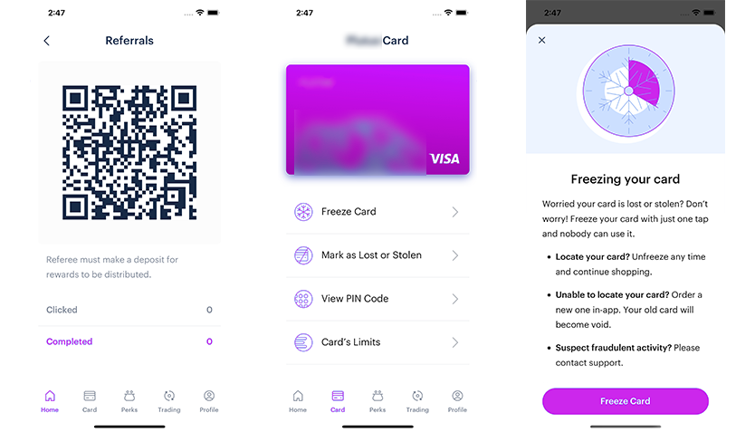 - A referral program, which is available after the card is activated and topped up. Both the existing user and the invited one get rewarded with tokens. There’s a screen that shows the history of the users being referred.