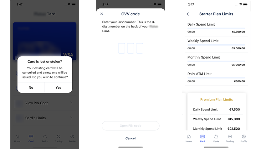 - Card profile that has options to activate the card, as well as freeze it, mark it as lost or stolen, view the PIN code, and see the card’s limit.