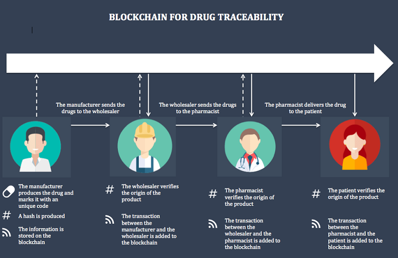 The lifecycle of drug transaction is as follows: manufacture-wholesaler-pharmacist-patient. Blockchain tracks this flow between parties to secure drug’s product information (picture 2).