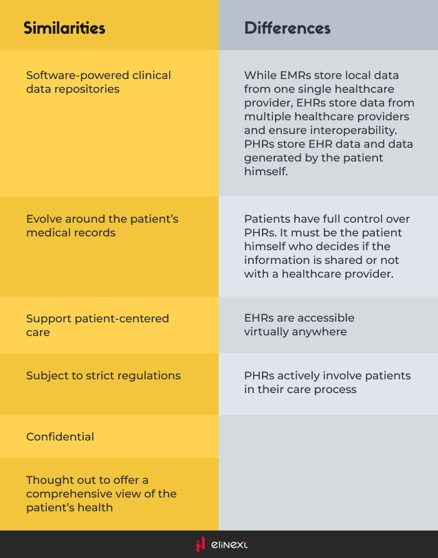 With similar features to EHRs, PHRs are patient-centered systems that patients manage directly in a confidential and secure environment. Basically, EHRs and PHRs store similar health data: medical history, medication, demographic data, immunization dates, allergies, diagnoses, etc. However, PHRs are enabled to store information that comes from other sources as well: