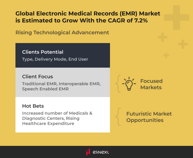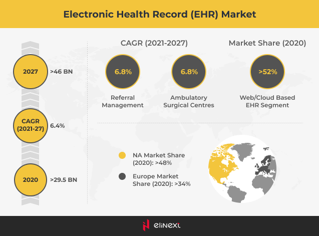According to Global Market Insights, in 2020, the EHR market was valued at $29.5 million. By 2027, it is expected to keep growing at a CAGR of 6.4%, reaching $46 billion.