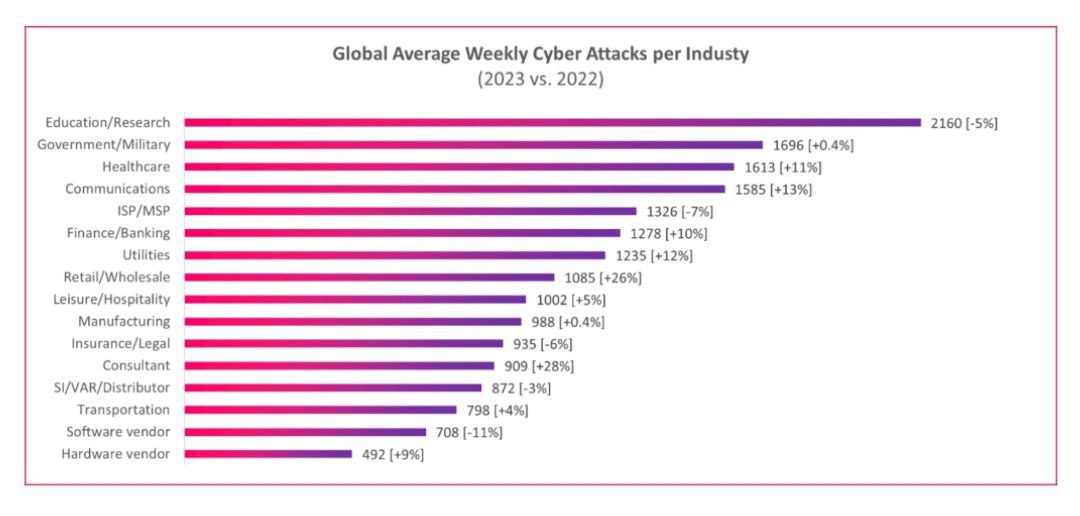 Global Average Weekly Cyber Attacks per Industry (2023 vs. 2022)