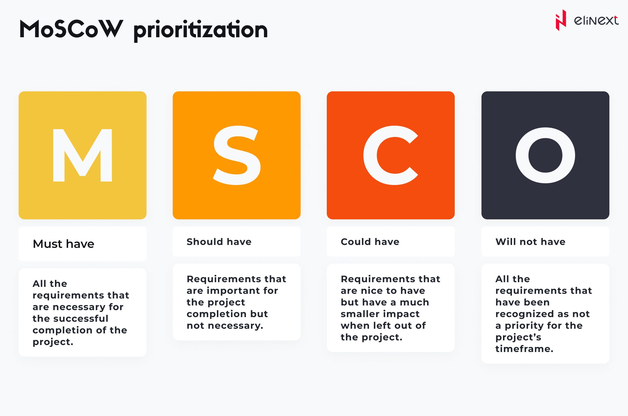 - MoSCoW matrix that divides features into logical subcategories: must-have, should-have, could-have, and won’t have this time.