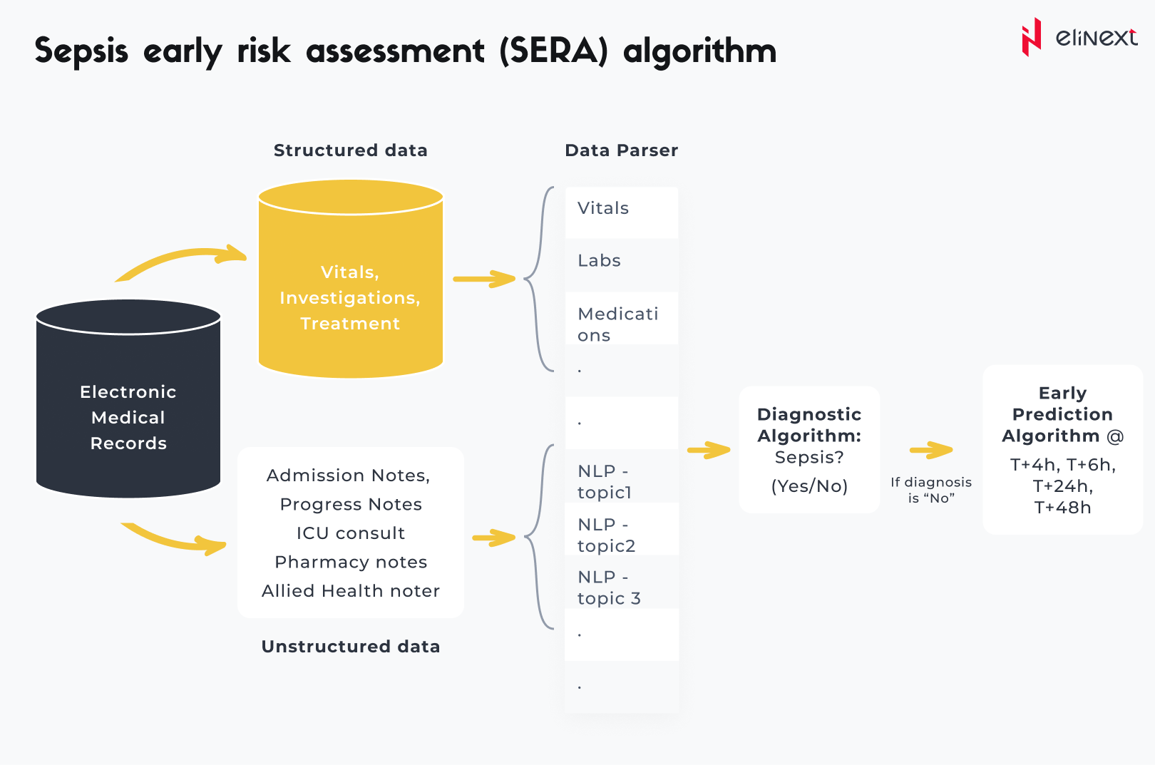 The scientists have developed a Sepsis Early Risk Assessment (SERA) algorithm. The whole principle description is available on the source link and is too complicated to be described here, but the flow diagram should give you a rough idea of how it should work.