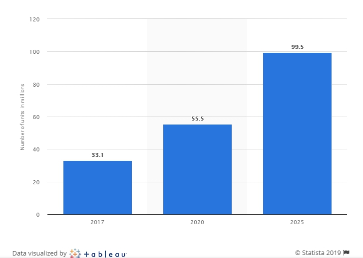 For instance, take a look at the number of Internet of Things (IoT) logistics units in the European Union (EU) in 2017, 2020 and 2025 (in million units).
